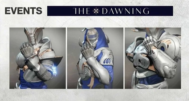 A Dawninggal kapcsolatos felszerelések is bekerülnek a játékba, melyekhez Tess-nél juthatunk hozzá, aki minden héten frissíti raktárát. Dawningos exoticok terén találunk majd hajókat, ghostokat, járgányokat és emoteokat is, de persze lesznek Dawningos páncélzatok is.