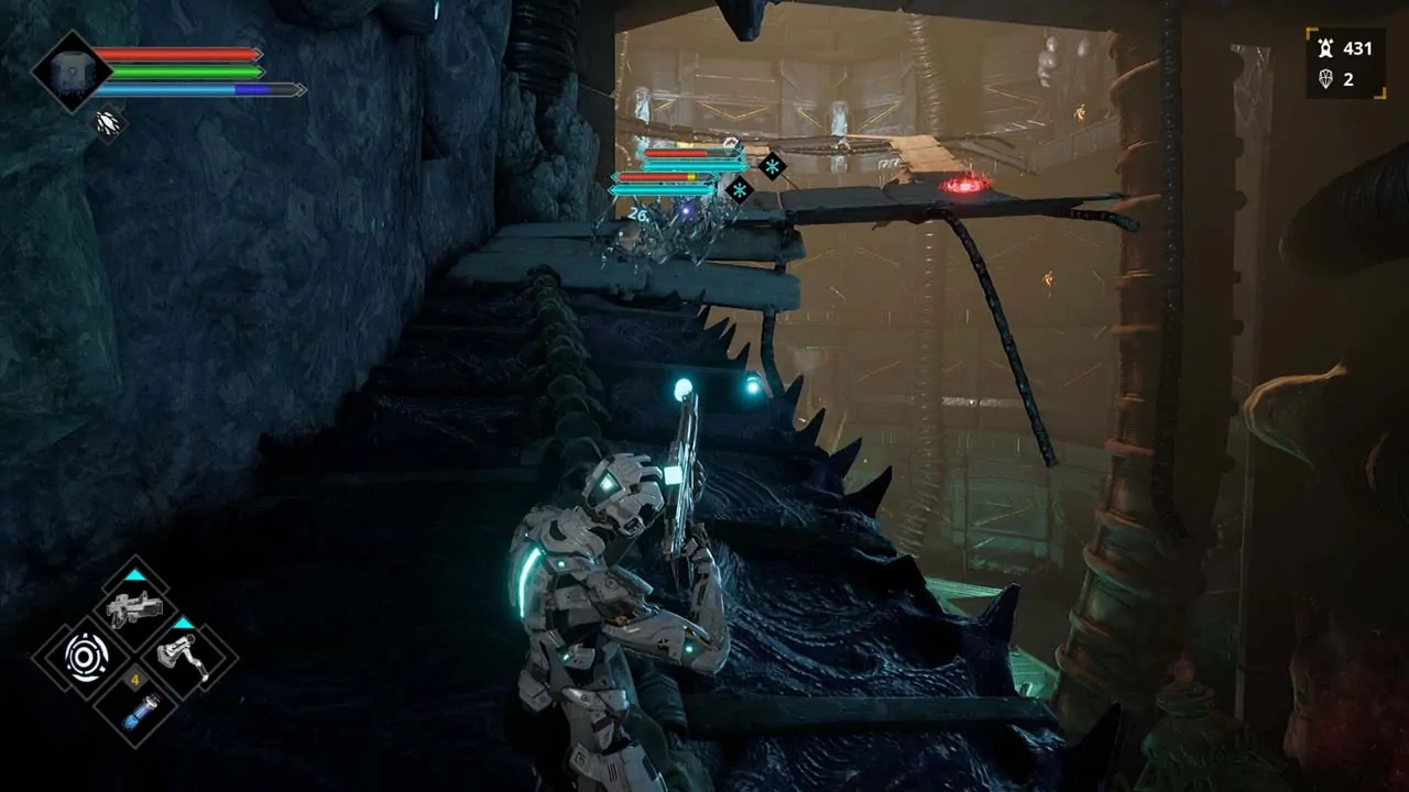 Az egyik ötlet, amivel megdobták egy kicsit az alap souls-like elgondolást, az az energia csík. Ezt tölthetjük alaptámadásokkal, de elemek elfogyasztásával is, amikre gondolhatunk Estus flaskaként is. Energiából tudunk gyógyulni, de ugyanígy energiát használ az is, ha használjuk lőfegyvereinket, vagy bekapcsoljuk az Energia Módot, ami az elemekkel szembeni érzékenységgel áll kapcsolatban. Energia módban támadásaink enerigát használnak stamina helyett, és attól függően, milyen cuccban vagyunk, ezek a támadások elemi erőt kapnak (tűz, jég, sav.)